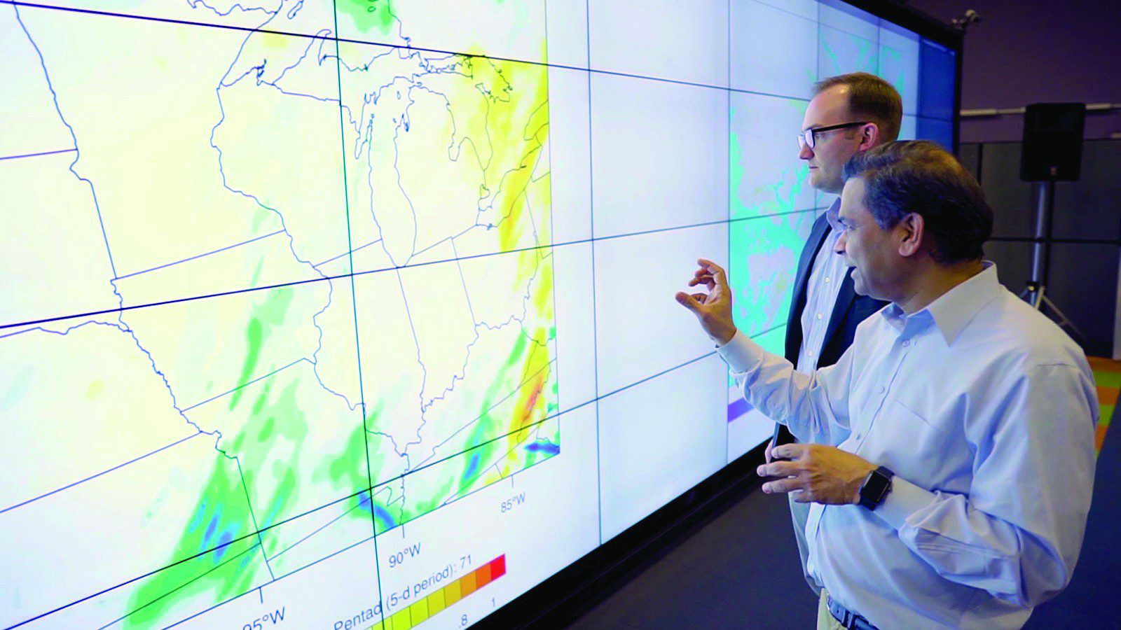 Argonne National Laboratory- Argonne’s Rao Kotamarthi (right) and Tom Wall (left; glasses) look at visualizations of climate data.