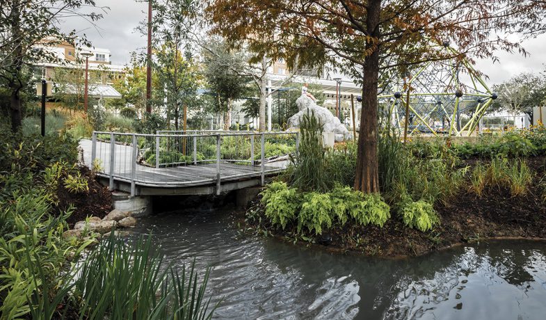 “Working together with bioswales and rain gardens, the LID features at Midtown Park have proven to enhance economic and environmental resiliency by protecting against flooding while improving water quality,” adds Marshall. “During extreme rainfall events, like Hurricane Harvey, the ‘bayou’ has detained stormwater to prevent local flooding and property damage.”