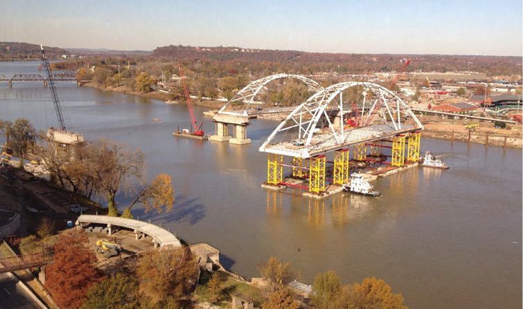 Construction of the Veterans Memorial Bridge took advantage of the self-supporting nature of tied-arch spans. Both 440-foot network tied-arch spans were pre-assembled on custom falsework towers supported by barges, located immediately downstream of the existing bridge and out of the main navigation channel. After each span was assembled at nearly its final elevation, the barge-supported arches were maneuvered into their final locations using tugboats and winch lines, then lowered onto permanent bearings by ballasting the barges. This nifty bit of just-barely offsite construction significantly minimized the closure time of the bridge and avoided prolonged disruption of road and river traffic as well as increased safety to the contractor and the public.