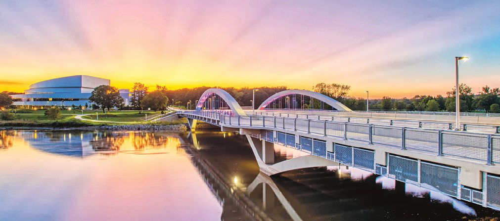 HNTB’s tied-arch bridge design, completed in 2018, is actually the New Park Road Bridge, a replacement of the previous bridge called for as one of the two main components of the “Iowa City Gateway”—the $42 million project resolved University access issues brought to light during the devastating flood of 2008, when the Iowa River crested at a record 31.53 feet (major flood stage is 25 feet), causing more than $270 million in damage to the area.