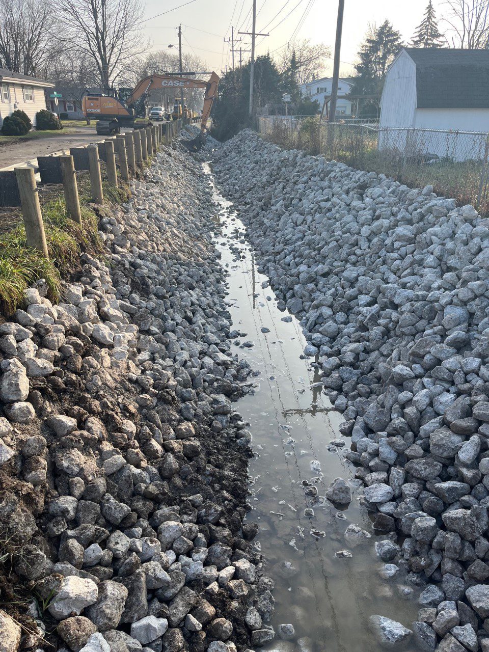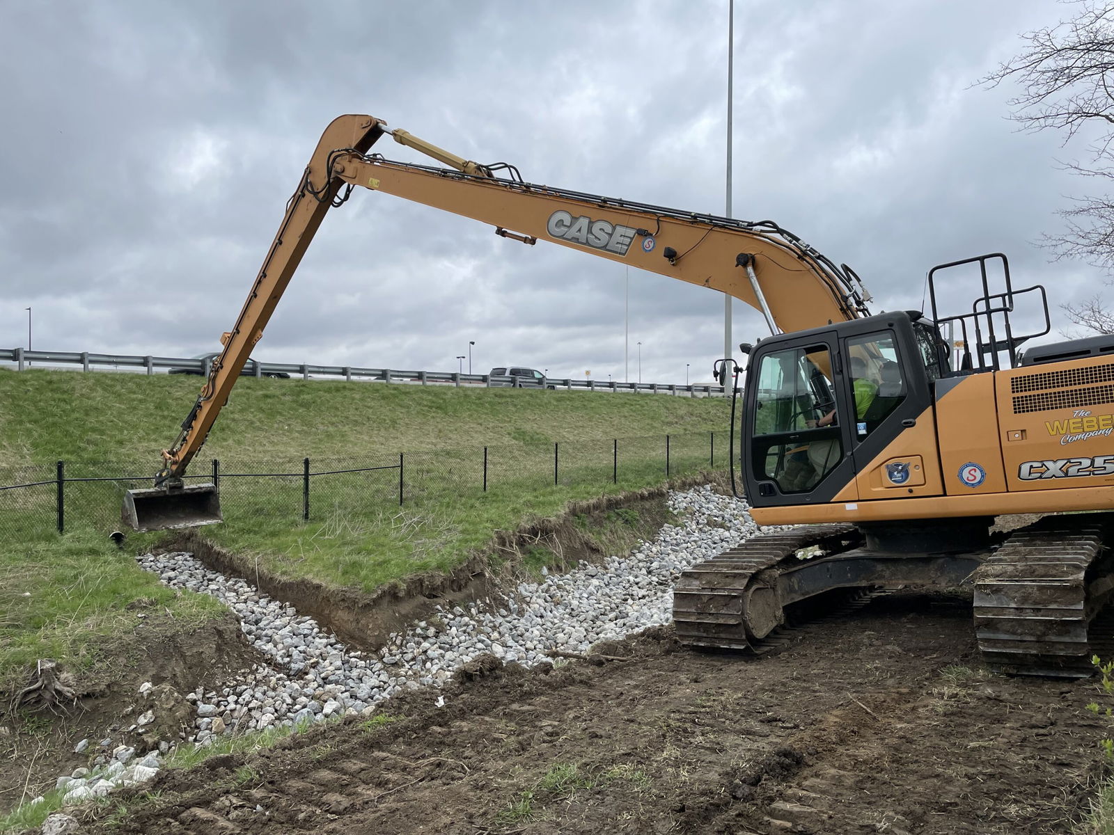 The drainage ditch in question, the Dalzell Ditch, is roughly three miles long and winds its way through several areas of town, including residential neighborhoods, industrial zones, through commercial areas including restaurants and hotels, adjacent to Findlay High School (skirting the track), and along Interstate 75. Weber was tasked by Hancock County with placing rip rap in roughly 2 miles of the ditch--areas that were most susceptible to erosion as marked by county engineers. Weber crews would restructure the steeply sloped ditch banks, those with slopes approaching 2:1, to better accommodate the incoming rip rap, grooming both sides if necessary to hold the sides in place and prevent further erosion and damage.
