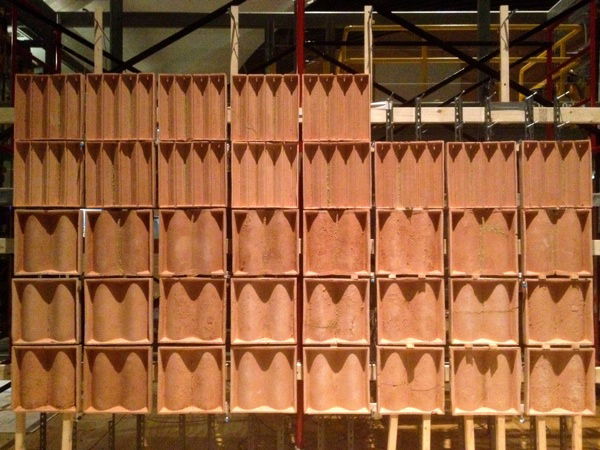 Fired clay is a familiar and relatively well-understood material; it's hard, for example, brittle, not very porous, etc. Green clay, by contrast, is somewhat mysterious; though it's been used for millennia in traditional building methods like cob and adobe, green clay—clay that is shaped, hardened, and used without kiln firing—is not really part of the modern builder's toolkit. In this cluster, Lilley and Hudson, together with materials engineer Kevin Plucknett, also of Dalhousie University, and Rory Macdonald, a ceramics professor of NSCAD University, were layering green clay onto fired tile substrates, exploring ways to use the varying properties of each synergistically.