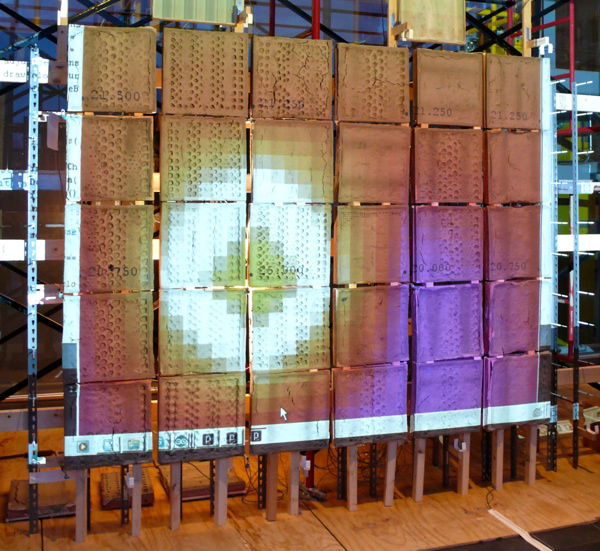 Here's how the cluster looked to visitors: A large steel framework was fashioned so that large tiles, about 12"x12", could be quickly mounted and arranged. Heat lamps, sprayers, and sensor were aimed at the composite tiles, and (literal) heat maps of sensor data, continuously updated, were projected onto the tiles as they were heated and cooled, wetted and dried.