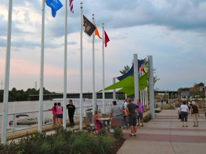 Key design features of the riverfront development include a daylighted channel with lighted waterfall; a pedestrian “wishing bridge”; The Wharf that offers boat and kayak access to the river; and the Adirondack picnic plaza. The next phase will include a park with extensive play equipment, a restroom and concession building, a jumping jet fountain, a fitness area with outdoor exercise equipment and a challenge course.
