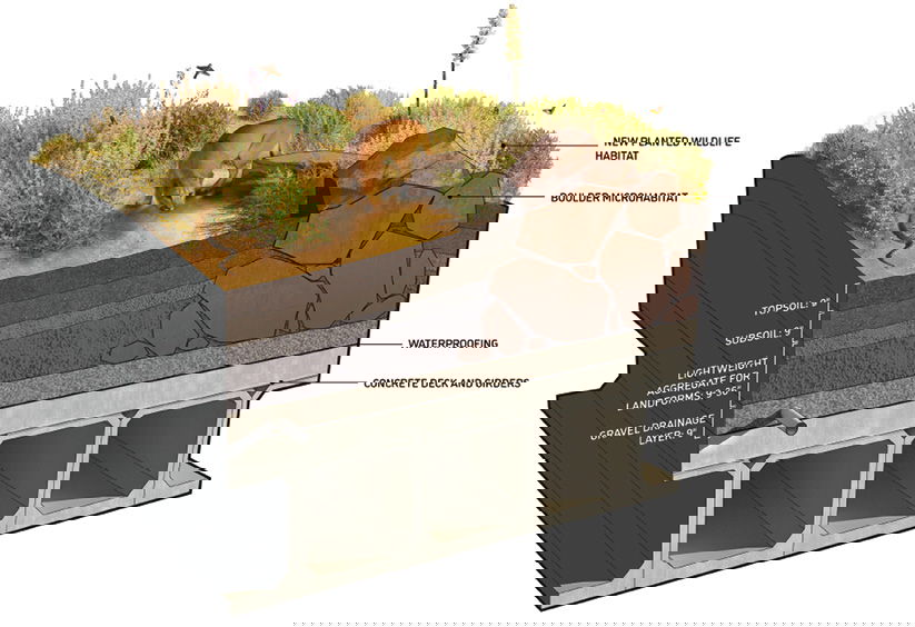 “Thinking about how water interacts with structures is one of those hallmarks for structural engineering,” says Rock. “It’s a cardinal sin to hold water on top of the structure. When you’ve got essentially a giant green roof perched on top of this massive structure, there’s a thoughtful process into not just the structural principles to support that dead load, but also thinking about saturation of that soil and vegetative layer, and how does that change the dynamics you have to evaluate when you’re looking at it through that structural lens.”