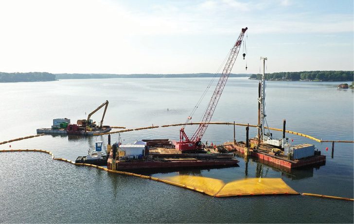 A distinctive aspect of the YRWSP involved the project team working from a barge to construct the new water-intake facility on Lake Tillery. The barge was launched upstream and positioned near the pump-station site, allowing construction materials to be staged nearby. With its large crane, the barge minimized disturbance to the shoreline and surrounding lake ecosystem during material transport.